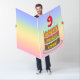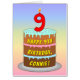 This joyful and cheerful birthday greeting card design features a cartoon-style depiction of a three-tier birthday cake having a number-shaped candle on top showing the age “9“, along with the message “HAPPY 9TH BIRTHDAY,”, and a customizable recipient name. The background of the front has a multicolored pastel rainbow spectrum inspired gradient pattern. The inside features a personalized birthday greeting message, or could perhaps be cleared and left blank if a message is to be written by hand instead. A colorful, customized birthday greeting card like this might be a fun way to deliver birthday greetings to somebody who is celebrating their ninth birthday. [~Z0000626]