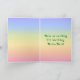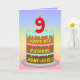 This joyful and cheerful birthday greeting card design features a cartoon-style depiction of a three-tier birthday cake having a numeral-shaped candle on top showing the number “9“, along with the message “HAPPY 9TH BIRTHDAY,”, and a personalized recipient name. The background of the front has a multicolored pastel rainbow spectrum inspired gradient pattern. The inside features a personalized birthday greeting message, or could perhaps be cleared and left blank if a message is to be written by hand instead. A fun, personalized birthday greeting card like this might be a fun way to send birthday greetings to somebody who is celebrating their ninth birthday. [~Z0000625]