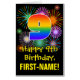 The front of this joyful, fun, and cheerful birthday-themed greeting card design features a large number “9” with a rainbow spectrum gradient inspired pattern, along with the message “Happy 9th Birthday,”, and a personalized recipient name. The front additionally has a vibrant and colorful background pattern inspired by the look of bursting celebratory fireworks. The inside features a personalized birthday greeting message, or could perhaps be cleared and left blank if a message is to be written by hand instead. A birthday card like this might be a fun way to send birthday wishes to somebody who is celebrating their ninth birthday. [~Z0000526]