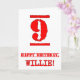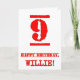 This fun birthday themed greeting card design features a large red number “9” having a rubber stamp inspired appearance, in addition to the birthday greeting message “HAPPY BIRTHDAY,” and a personalized name on the front. The inside has a customizable birthday greeting message, or could perhaps be cleared and left blank if a message is to be written by hand instead. A fun personalized birthday greeting card like this might be sent in celebration of somebody’s ninth birthday. [~Z0000524]