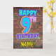 The front of this fun birthday themed greeting card design features the message “HAPPY 9TH BIRTHDAY,” having a colorful, vibrant, graffiti-inspired appearance, in addition to a personalized recipient name. The background of the front features a pattern inspired by the look of a brick wall. The inside has a customizable birthday greeting message, or could perhaps be cleared and left blank if a message is to be written by hand instead. A fun, customized birthday greeting card like this might be sent to celebrate somebody’s ninth birthday. [~Z0000531]
