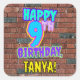 This fun birthday-themed square sticker design features the message “HAPPY 9TH BIRTHDAY,” having a vibrant, colorful, graffiti and urban street art inspired appearance, along with a customizable recipient name. The background features a brick wall inspired pattern. Fun, vibrant, personalized stickers like this might be given as a birthday present, or used while wrapping gifts, or perhaps used as a birthday party decoration when celebrating somebody’s 9th birthday. [~Z0000535]