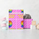 This happy and festive 9th birthday themed wrapping paper design features a large number "9" having a colorful pattern inspired by the look of a rainbow spectrum. It also features the message "Happy 9th Birthday,", followed by a custom name. The background features a dark pink and light pink stripes pattern containing loving pink heart shapes. Birthday themed wrapping paper like this might be a fun way to wrap a gift or present being given to celebrate somebody’s 9th birthday. [~Z0000415]