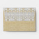 A6 Size Envelope. NOTE: this is a flat printed design, there are no raised lace, fabric or layered elements on this product. COLOR PALETTE: white, tan, burlap DESIGN COLLECTION: Matching two sided, printed, return address square wedding invitation envelope. This is a modern BOHO or Bohemian Style, gypsy inspired, trendy chic stylish look. It has a simple, clean yet lovely beauty. Created from vintage Victorian or Edwardian era swirl baroque deep drop leaf lace pattern and tear drop design ornaments that have been graphically hand transformed into an elegant beautiful, sophisticated lace trim border. The laces are laid on top of a tea stained burlap textured background pattern. A complete wedding invitation set is available to match. The reverse side has the tear drop, diamond swirl point lace pattern in a full repeat pattern.