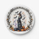Celebrate the upcoming arrival of your little one with these enchanting paper plates. Featuring a vintage-style illustration of a pregnant witch in a floral starry gown, a bubbling cauldron with purple smoke, pumpkins, and elegant Halloween floral accents, these plates are the perfect mix of whimsical and spooky. Personalize it with your event details and impress your guests with a magical start to your celebration. Ideal for fall or Halloween-themed baby showers.