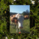 This adorable postcard features a sweet baby Swiss cow with big brown with a curious expression. The cow is standing in a lush green field, surrounded by wildflowers and a beautiful blue sky. The image is beautifully detailed and full of charm, making it the perfect way to send a warm greeting to friends and family.