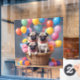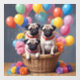 Three adorable pugs sit in a wicker basket overflowing with colorful flowers. A cheerful bunch of balloons in various hues floats above them, adding to the festive atmosphere. The pugs, each wearing a red collar, gaze directly at the viewer with their signature endearing expressions.