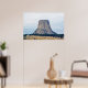 A photograph of a laccolithic butte known as, Devils Tower National Monument, towering over the landscape of rural Wyoming, one Summer day.