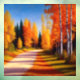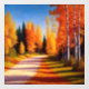 The colors in the picture are vibrant and rich, with warm oranges, yellows, and reds blending together to create a stunning autumnal palette. The birch trees are rendered in exquisite detail, with the white bark standing out in sharp contrast against the surrounding foliage. The painting has a sense of movement and life that is almost tangible, with the viewer feeling as if they are walking down the driveway themselves.