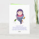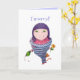 Illustration of a girl standing looking up, a blue rope tied around her, holding a flower in one hand and a tea cup in the other, a cat peeking out from behind her legs. A delightful, whimsical card or gift to apologize for not keeping in touch, say sorry for being so busy, and thinking of you! Also available as a lovely matching postcard, sticker, magnet, bag, t-shirt.