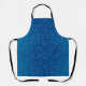 A blue apron with a subtle polka dot pattern is displayed on a white background and worn by a smiling person in a light blue shirt.