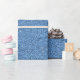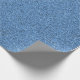 a roll of blue glitter wrapping paper partially unrolled on a white background, showing its sparkly texture and curled edge