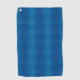 A blue towel with a subtle dotted pattern hangs vertically. A metal grommet with a ring is attached at the top left corner. The background is plain.