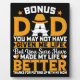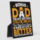 A heartfelt tribute to the incredible bond between a bonus dad and their child. This design beautifully acknowledges the role of a stepfather with a message full of gratitude, love, and humor. Featuring bold typography in white and orange, the words “BONUS DAD” stand out proudly, paired with a mustache and hat graphic that embodies wisdom and fatherly strength. The touching words express appreciation: “You may not have given me life, but you sure have made my life better. Thanks for putting up with my mom.” Small hearts and stars subtly enhance the emotional depth, making this the perfect way to honor a bonus dad’s unwavering support and love.
