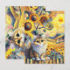 A whimsical scene features a cat sitting on a fence, surrounded by vibrant sunflowers and colorful dragonflies. The background includes rolling hills, a bright sun, and a playful arrangement of swirling patterns. Digital Art Photoshop CS5