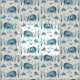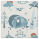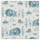Camping in the atomic fir forest, during a lightening storm, terrorized by pterodactyls, a UFO abducts a camper's favorite lawn flamingo; in blues and rust on an off white/tan/gray distressed background.