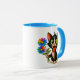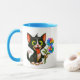 A cute cat on a mug: a lively image, a colorful universe with a black and white cat, a joyful and lively scene. Too cute with expressive eyes and a bouquet of colorful flowers, this image brings a touch of happiness and tenderness.