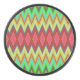 A circular speaker with a vibrant, zigzag pattern hockey puck