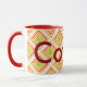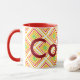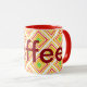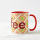 Large designer coffee mug, yellow, green, burgundy and red. Text can be personalized with a name, or text is also removable, to suit your kitchen style.