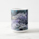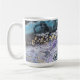 A unique coffee mug with an original artwork in blue, purple, and black by WestJack Studio. Designed in BC.