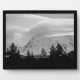 A black and white photograph of Mount Rainier. There are trees in the foreground. There are lenticular clouds forming and filling the surrounding sky at the top of the sleeping volcano. Image Copyright ©2023 Kimberly J Tilley. zazzle.com/store/developingnature