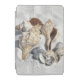 Seashells in a circular arrangement with spiral shells and clam shells completing the circle on the sand