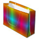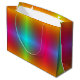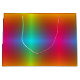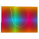 A colorful gift bag with a vibrant gradient pattern in rainbow hues. The design has a glossy finish and is equipped with a white handle, conveying a festive and cheerful tone.
