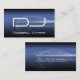 A cool dj businesscard template with a stunning design of blue laser lights in the night sky combined with black backlight music notes on a dark background.