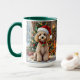An adorable personalized Christmas coffee mug with a festive poodle sitting in front of the fireplace on a cold winter day. A Christmas tree decorated and a festive background.