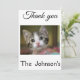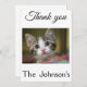 A thank you card, flat style with a tabby kitten with green eyes, with a blurry background