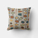 A cute mid century inspired throw pillow, with geometric pattern in warm retro colors of brown, orange, blue and green.