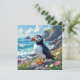 A beautiful vibrant colorful ai illustration of a puffing watching the ocean waves by the sea shore surrounded by rocks, dunes and flowers on a blank notecard.