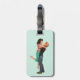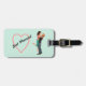 You can customize this adorable luggage tag that's perfect for newly-weds or other sweethearts. It's easy to replace the text in the love-heart with a name. The design features a cute couple with a vintage look on an aqua polka-dot background. The young lovers have an endearing toon appearance. She is a brunette with a bow in her hair, dressed in coral-pink and turquoise, and he has light red hair and wears jeans.