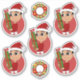Set of seven cut-vinyl stickers with an illustration of a cute happy Hispanic/Latino or Asian toddler boy, he is wearing a red and white Santa Claus hat and holding a Christmas present