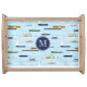 This unique boating themed serving tray features varied size seafaring vessels on a blue background with custom monogram on a dark blue circle pendant - the pattern includes 2 cargo ships, 2 sailing vessels, 2 antique-style wood boats, 1 fishing boat, a rowboat and a houseboat - close inspection of the pattern reveals people enjoying "A Day On the River" © katz_d_zynes 2020