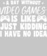 Funny quote for gaming lovers "A DAY WITHOUT VIDEO GAMES IS LIKE JUST KIDDING I HAVE NO IDEA". Take your gift for you or for the person who do you love mom, dad, brother, sister, friend. Funny gifts ideas for gaming lovers.