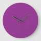 A deep purple background accented by a bright whit large clock