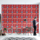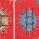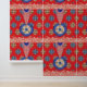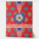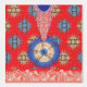 The design features a stunning fractal pattern. At the center, there’s a circular motif in blue and white, surrounded by intricate designs in shades of orange, brown, and blue. The background is a rich red with gold star-like patterns scattered throughout. This symmetrical fractal design is visually captivating and often symbolizes infinite complexity, whether in mathematics, nature, or art.