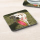 A dog with a frisbee coaster