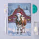Country Christmas style tissue paper with an illustration of a festive cow in a Santa hat standing in front of a gorgeous red barn decorated in Christmas lights and a festive wreath on a snowy winter day.