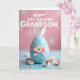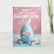 This card features a large pastel-blue egg shape covered in small multicolor dots, topped with two smooth white bunny ears 🐰. A soft pink ribbon wraps around the middle and ties into a neat bow, with a single white daisy and yellow center tucked in like a sweet little gift 🌷. The gentle lighting gives everything a dreamy glow, and the blush-pink background fades into soft star-like blurs that feel like a quiet celebration. Across the top, white text is centered above the egg, standing out clearly against the pink backdrop. On the blue surface below, scattered pastel confetti adds a light, friendly energy, as if the scene is dressed up for someone special. Broken eggshell pieces with warm peachy interiors sit around the base, hinting at a tender “just arrived” moment and a closeness meant for family or dear friends. The final detail is the crisp contrast between the smooth blue egg, the satin-like pink bow, and the jagged shell edges resting on the blue tabletop.