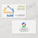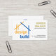 A white cover features a simple A-Frame building structure that houses two caption remarks i.e. "design" and "build" which you can change to suit your own service needs. At the top of the card lies your prestigious name in brown, the job title and the contact details near the base of the card.