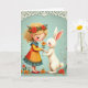 Designed with a soft, storybook look, this card shows a young girl and a white rabbit facing each other in a quiet, affectionate moment 🐰. The girl wears a crown of red-orange flowers and green leaves, and she leans forward with closed eyes and rosy cheeks as she offers a single orange bloom. The rabbit stands upright with long ears tipped in pink and a small red nose, meeting her gesture with a calm, attentive gaze that feels like close friendship. Her golden curls frame her face, and her dress layers warm yellow, orange, and red panels, finished with a teal collar and a ruffled edge. The background is a pale aqua wash topped with a creamy, lace-like pattern that arches along the upper edge like delicate trim. A short Easter greeting sits centered near the top in a light coral tone, with a smaller line of text underneath in soft gray. Near their feet, tiny flowers and scattered petals drift across the ground, with a few tulip-like shapes tucked among them 🌷.