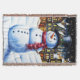 A cheerful snowman wearing a top hat and red scarf stands in the foreground of a snowy village scene. Twinkling lights from the houses illuminate the night sky, creating a festive and cozy atmosphere. Digital Art