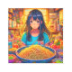 Anime Girl with a huge bowl of Ramen and Japanese spices in the background.
