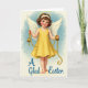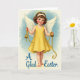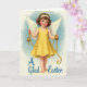Designed with a sweet, cherub-like child centered on the front, this card shows rosy cheeks, bright blue eyes, and a gentle smile that seems to reach out like a friendly hello 🌷. A thin golden halo floats above her curly brown hair, which is held back by a simple white band, and her wide feathered wings fan out behind her as if wrapping the scene in a soft embrace. She wears a sunny yellow dress with flowing folds, and she lifts two shiny golden bells on braided cords, as though she’s ringing in the day for someone she cares about 🐰. The background fades from a sky-blue glow around her wings into a warm cream near the bottom, giving the whole setting a light, airy look. Small details like her neatly painted fingernails and bare feet add a tender, close-up feel, like a keepsake image meant to be held onto. Near the bottom, the words “A Glad Easter” appear in elegant blue lettering, centered beneath the illustration. The bells catch the light with bright highlights, and the blue-to-cream backdrop stays smooth behind her outstretched wings.