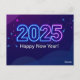 Step into 2025 with a postcard design that blends futuristic innovation with refined elegance. Featuring a dark metallic gradient with subtle holographic accents, this design evokes a sense of sophistication and high-tech allure. The year '2025' stands bold in a sleek, modern font, glowing with silver neon and platinum highlights, creating a striking visual. Geometric shapes, like floating triangles and circles, add depth, while soft glowing lines and reflections bring a dynamic, futuristic feel. "Happy New Year 2025" is elegantly displayed in a minimalist serif font, radiating luxury and class. This postcard embodies a celebration of innovation, optimism, and the bright possibilities of the new year.