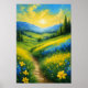 Transform your space with the captivating allure of a poster showcasing a vivid digital artwork. A picturesque scene unfolds: a lush green valley adorned with a carpet of blue and yellow flowers. This poster captures the harmony of colors in nature's embrace, inviting you to immerse yourself in the tranquil beauty of a blooming paradise.