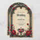 A gothic romance. An ornate, gothic-style frame surrounding a beige background. Red roses with dark green leaves are arranged around the frame, particularly in the corners. At the bottom center, there is a decorative heart-shaped emblem with the word "LOVE" inscribed in a stylized font.