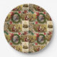 This design features a repeating Christmas pattern that looks like old-fashioned wrapping paper. It displays classic pictures of Santa Claus in his red suit standing next to a reindeer, along with large green holly wreaths tied with red ribbons that circle a snowy winter scene. The design is filled with traditional holiday details like lit candles, scrolls with greetings like "A Happy Christmas Tide," and warm colors that create a cozy and festive feeling.
